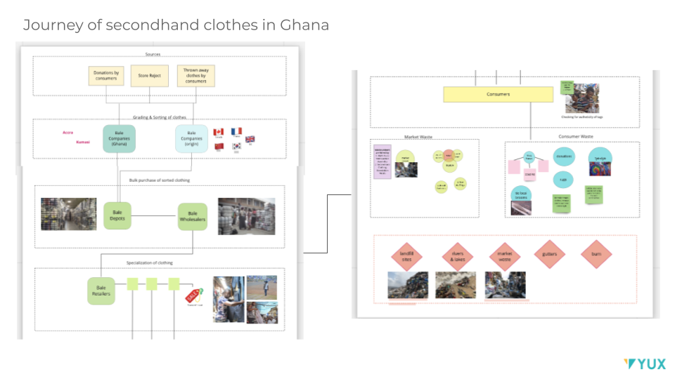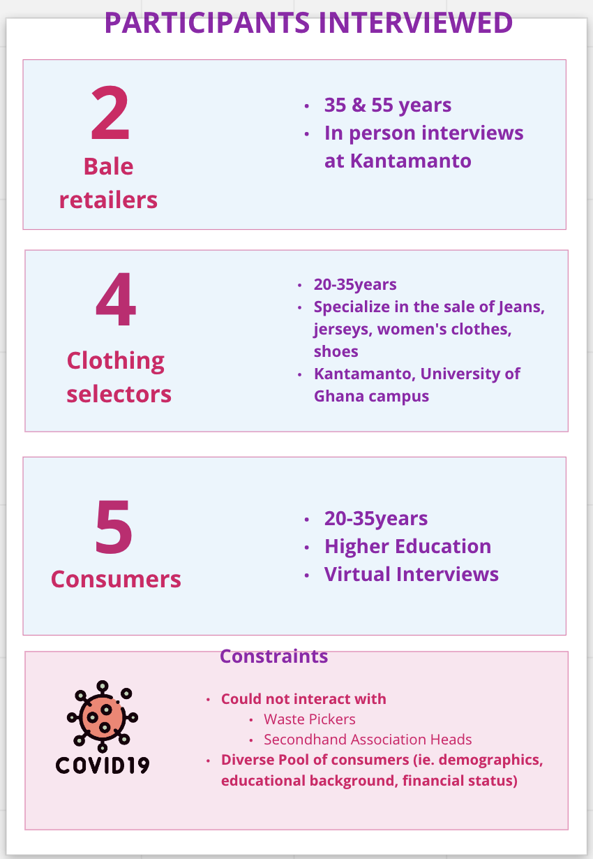 The research goal was to understand the perceptions of the different stakeholders within the flow of secondhand clothing within the Ghanaian market and the ecological impact at each stage. We developed tailored questions to understand the thoughts bale retailers, bale selectors, and consumers. This research exposed some of the difficulties consumers find disposing of their secondhand clothes therefore, we developed a solution to suit this problem.