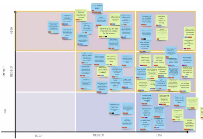 The research analysis and synthesis phase seamlessly transitioned into a 2-hour creativity workshop, engaging key partners and decision-makers from the Justdiggit team. This collaborative session aimed to identify, explore, and prioritize opportunity areas. Leveraging the Red Routes tool, we meticulously assessed features based on their perceived impact versus the effort required for implementation. Features falling under "High Impact, Low Effort" and "High Impact, Medium Effort" were earmarked for the upcoming implementation phase.