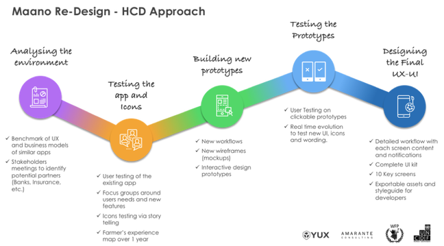 To help address these challenges, WFP requested the support of UNCDF, who had demonstrated strong experience in working with private sector players in introducing human-centered design into the Zambian market. UNCDF, worked with Amarante and YUX with the aim of improving the user experience of the app and enriching the Maano ecosystem with high-value services dedicated to farmers. The partners applied a human-centered design approach to gather qualitative feedback on existing and potential app features, test prototypes and create a more robust user experience and user interface (see the figure).