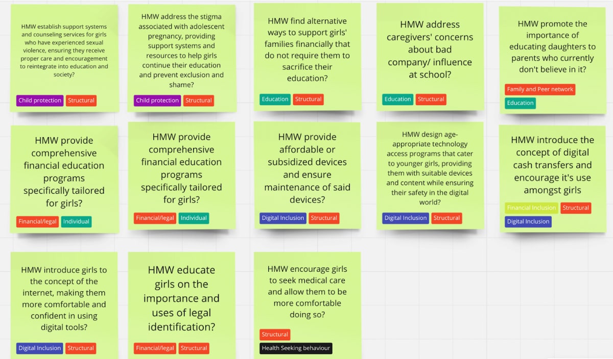 Following the synthesis of data gathered during the data collection phase, the YUX team identified various challenges related to various focus areas including education, health seeking behavior, digital and financial inclusion. These challenges were then accompanied by corresponding "How Might We" (HMW) questions.