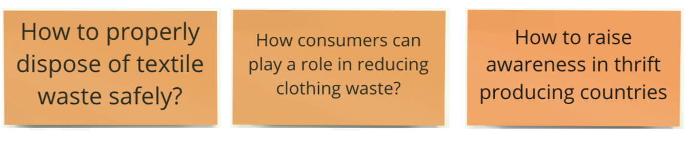 The research goal was to understand the perceptions of the different stakeholders within the flow of secondhand clothing within the Ghanaian market and the ecological impact at each stage. We developed tailored questions to understand the thoughts bale retailers, bale selectors, and consumers. This research exposed some of the difficulties consumers find disposing of their secondhand clothes therefore, we developed a solution to suit this problem.