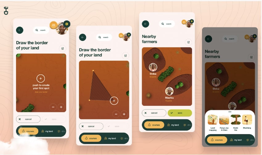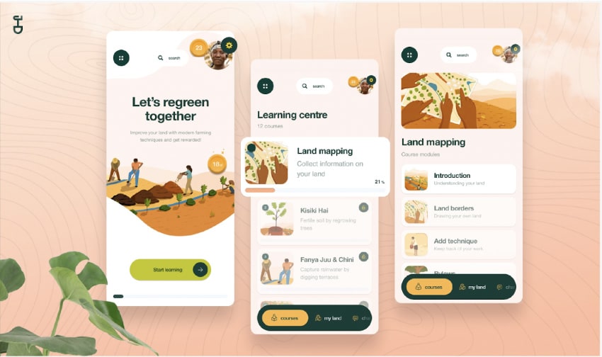 The Regreen Application, initiated by Justdiggit, employs a gamified approach to provide tailored and step-by-step regreening education and advice to farmers. (read more here). Regreening, the process of restoring landscapes and improving soil fertility, is facilitated through interactive quizzes, videos, leaderboards, and direct communication with regreening experts.