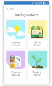 While the Maano app was designed to function as a virtual marketplace, discussions with the farmers revealed other challenges in their daily lives. These discoveries helped generate ideas for potential features that could be included in the app. Some were added in the prototypes and tested directly, while others were just discussed with the farmers to assess their reactions. In the end, the additional services fell into four categories: weather forecast and advice, market prices, financial services and farming advice (see the screenshot).
